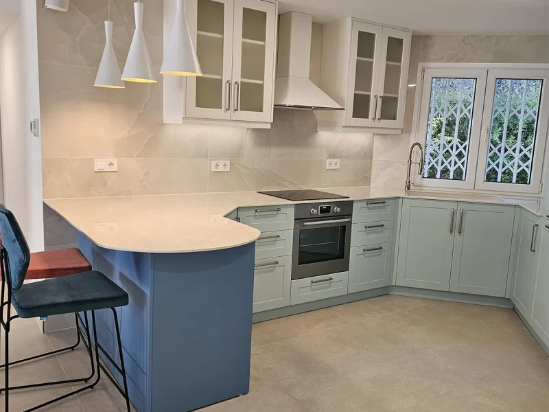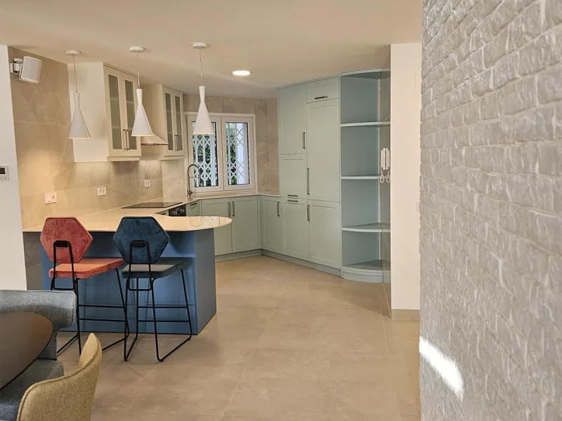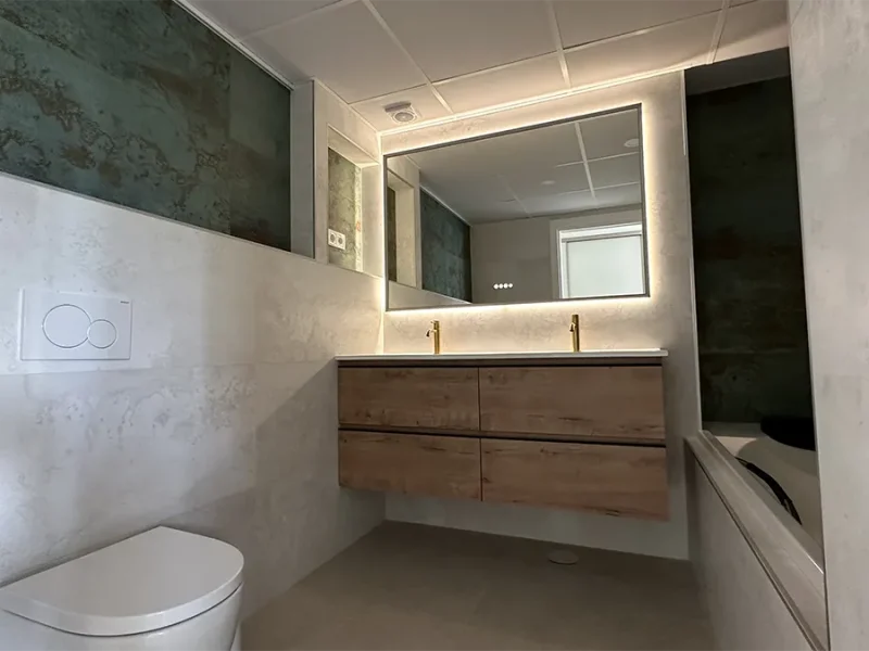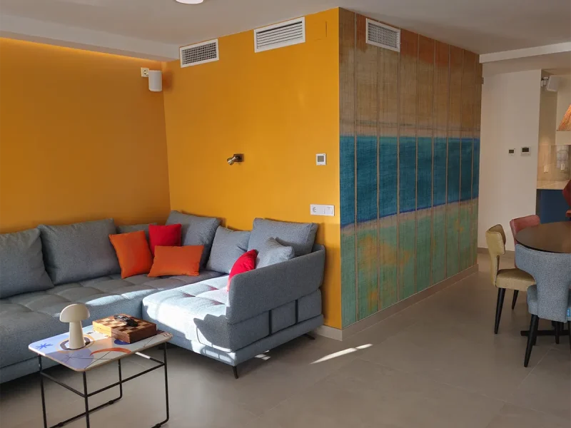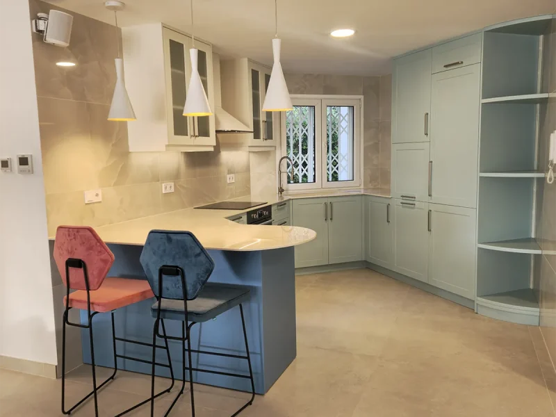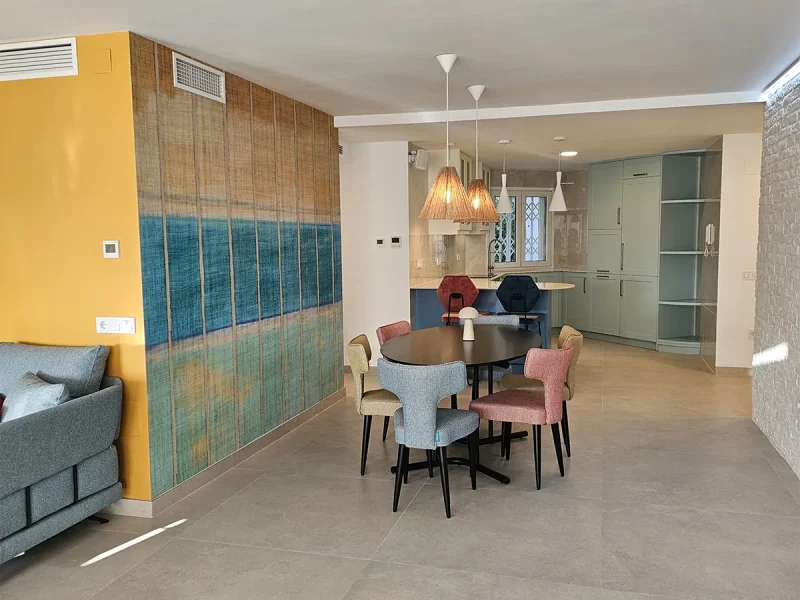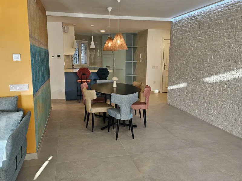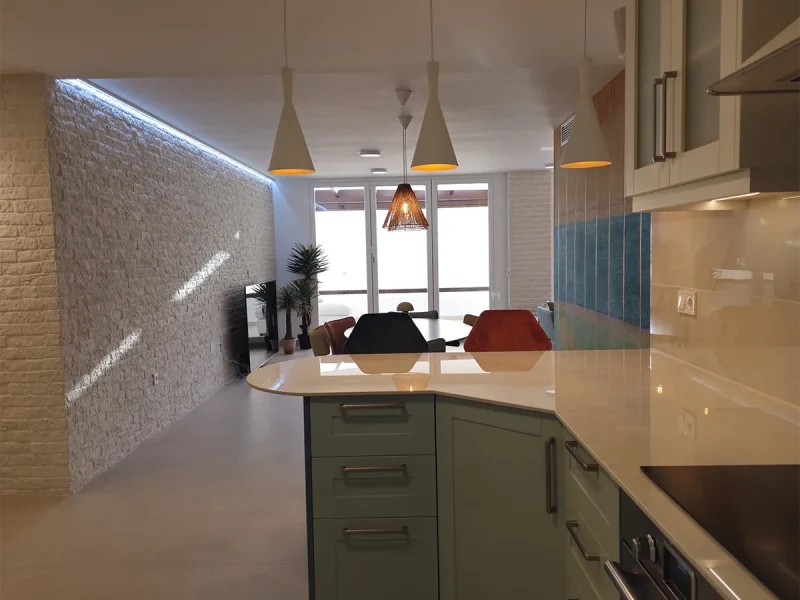 En el proyecto El Limonar, hemos transformado la cocina cerrada para integrarla al salón, permitiendo disfrutar de las maravillosas vistas de la vivienda. Ampliamos el salón incorporando parte de uno de los dormitorios, creando un espacio cómodo y amplio. Revestimos una de las paredes con plaqueta decorativa de imitación ladrillo, complementada con iluminación indirecta para darle un toque especial. Instalamos suelo radiante en toda la vivienda, garantizando calidez y confort en cada rincón durante todo el año.